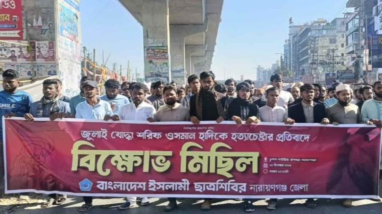 ইনকিলাব মঞ্চের মুখপাত্র ওসমান হাদীর ওপর গুলিবর্ষণের ঘটনার প্রতিবাদে নারায়ণগঞ্জ জেলা ছাত্র শিবিরের উদ্যোগে বিক্ষোভ সভা ও মিছিল অনুষ্ঠিত হয়েছে।শনিবা...